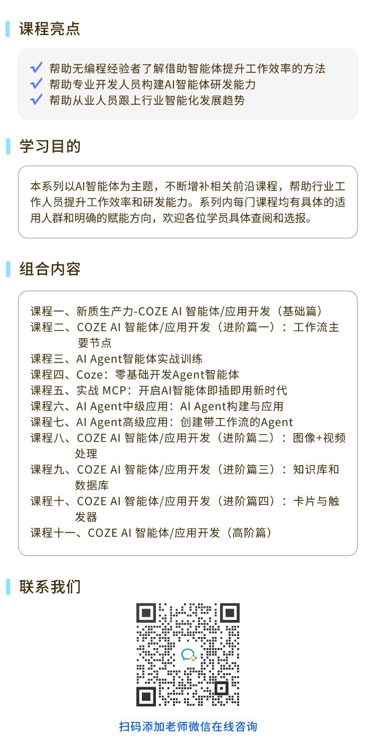 COZE AI 智能体/应用开发(高阶篇)本课程打通COZE与外部第三方工具生态链路,探索COZE应用开发,构造全方位、多维度的COZE应用体系。¥830 查看详情