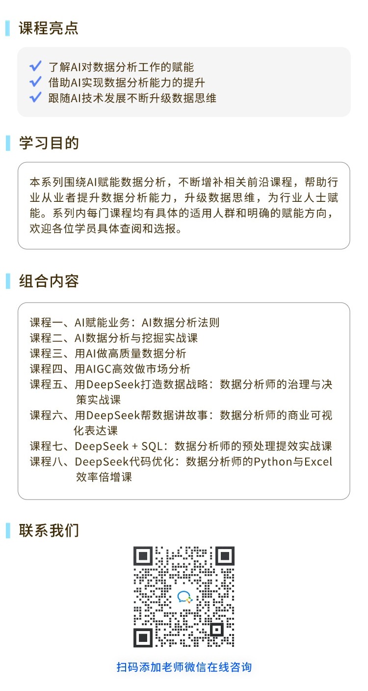 AI数据力系列本系列围绕AI赋能数据分析,不断增补相关前沿课程,帮助行业从业者提升数据分析能力,升级数据思维,为行业人士赋能。系列内每门课程均有具体的适用人群和明确的赋能方向,欢迎各位学员具体查阅和选报。¥1030