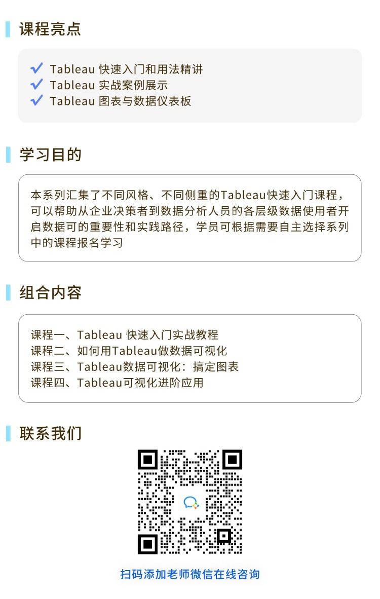 Tableau数据可视化系列本系列汇集了不同风格、不同侧重的Tableau快速入门课程,可以帮助从企业决策者到数据分析人员的各层级数据使用者开启数据可的重要性和实践路径,学员可根据需要自主选择系列中的课程报名学习¥670