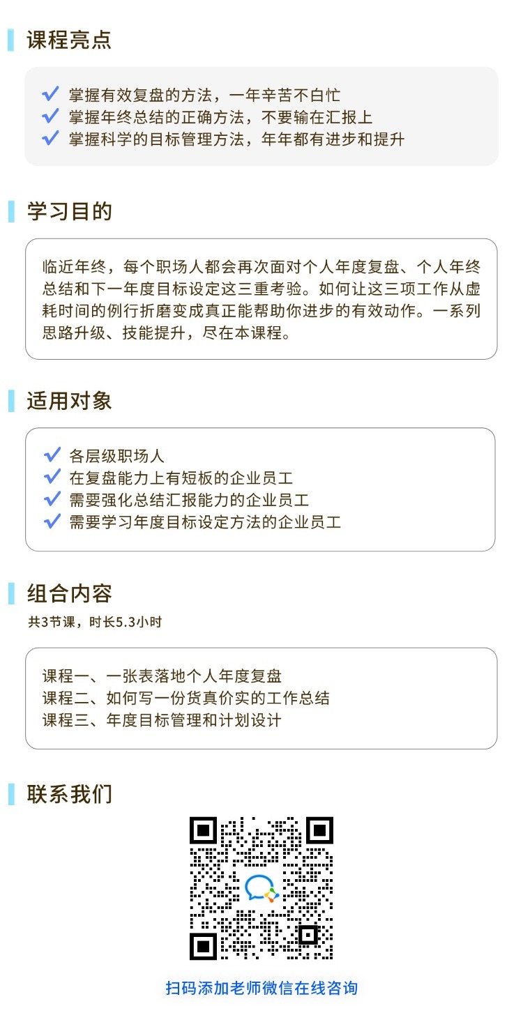 年终复盘总结与目标计划临近年终,每个职场人都会再次面对个人年度复盘、个人年终总结和下一年度目标设定这三重考验。如何让这三项工作从虚耗时间的例行折磨变成真正能帮助你进步的有效动作。一系列思路升级、技能提升,尽在本课程。¥350