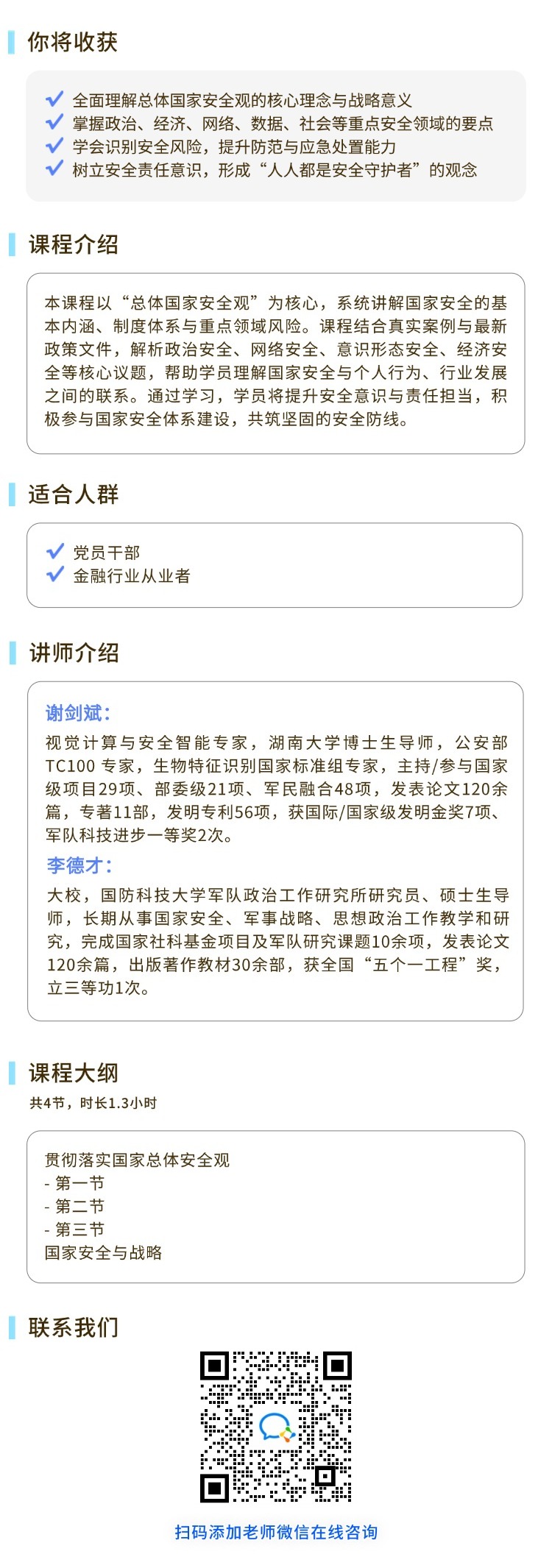 国家安全教育专题:总体国家安全观与风险防控实务本课程以“总体国家安全观”为核心,系统讲解国家安全的基本内涵、制度体系与重点领域风险。报名费:¥1