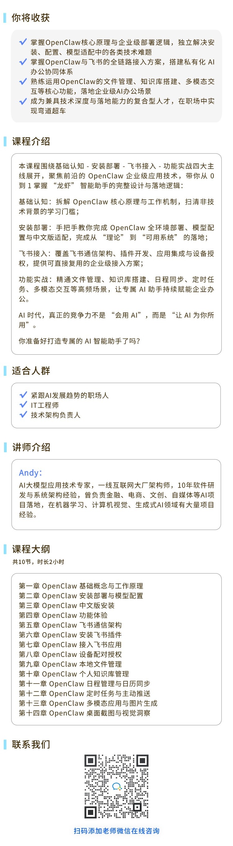 OpenClaw企业级应用实战本课程围绕基础认知-安装部署-飞书接入-功能实战四大主线展开,带你从0到1掌握“龙虾”智能助手的完整设计与落地逻辑。报名费:¥60