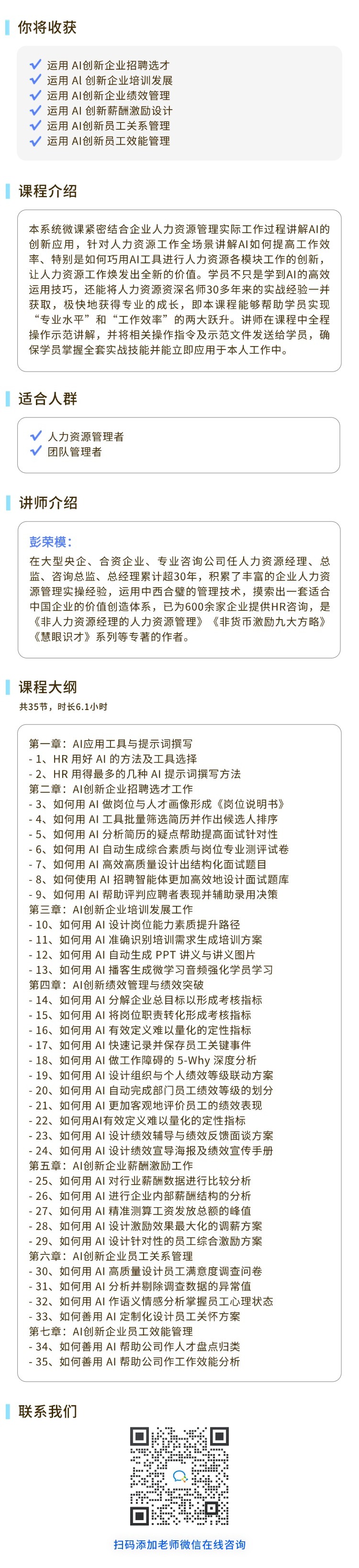 AI全场景创新人力资源管理课程紧密结合企业人力资源管理实际工作过程讲解AI的创新应用,针对人力资源工作全场景讲解AI如何提高工作效率及各模块工作的创新,让人力资源工作焕发出全新的价值。报名费:¥180
