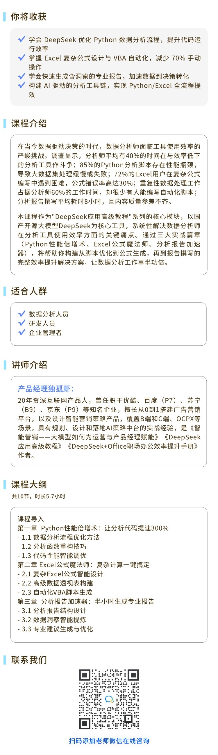 DeepSeek代码优化:数据分析师的Python与Excel效率倍增课本课程通过三大实战篇章,将帮助你构建从脚本优化到公式生成,再到报告撰写的完整效率提升解决方案,让数据分析工作事半功倍。报名费:¥170