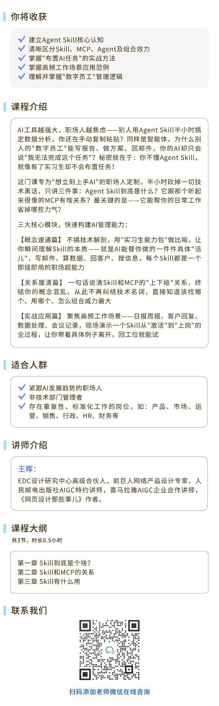 半小时快速了解Agent Skill建立Agent Skill核心认知,清晰区分Skill、MCP、Agent及组合效力。报名费:¥20