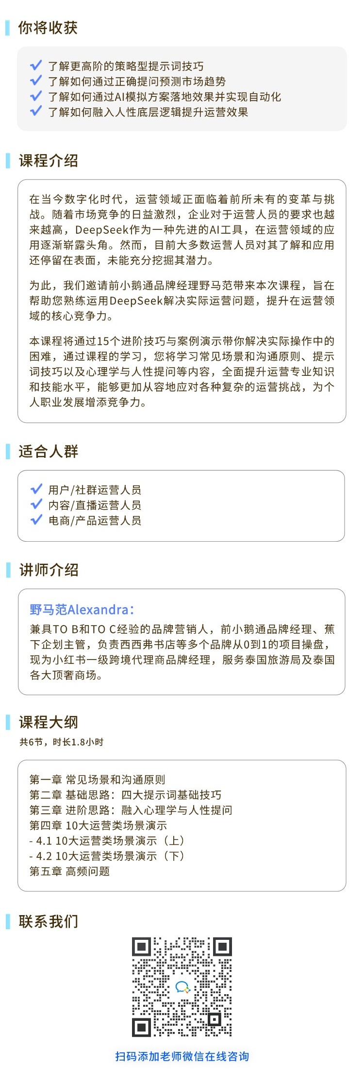 运营人使用DeepSeek的15个进阶技巧您将学习常见场景和沟通原则、提示词技巧以及心理学与人性提问等内容,全面提升运营专业知识和技能水平,能够更加从容地应对各种复杂的运营挑战。报名费:¥50