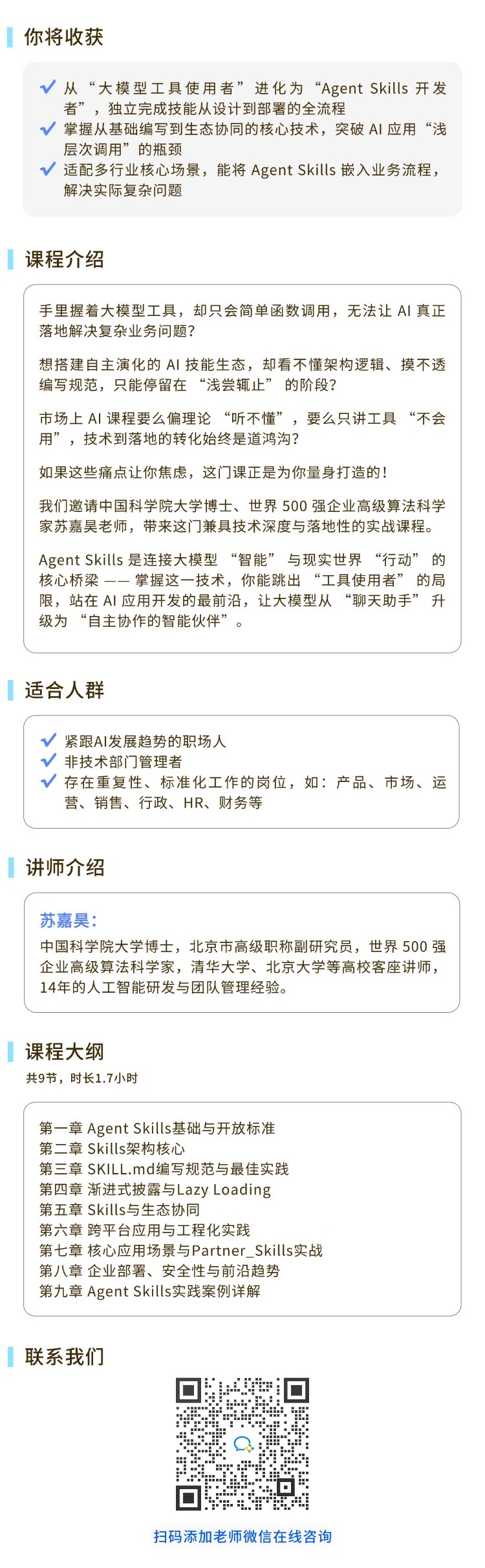 Agent Skills 核心技术:从入门到精通从“大模型工具使用者”进化为“Agent Skills 开发者”,独立完成技能从设计到部署的全流程。报名费:¥50