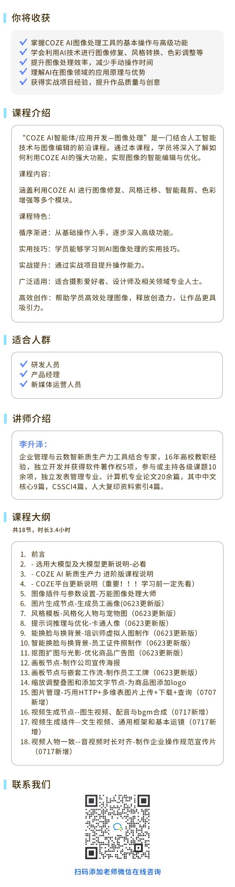 COZE AI 智能体/应用开发(进阶篇二):图像+视频处理“COZE AI智能体/应用开发—图像处理”是一门结合人工智能技术与图像编辑的前沿课程。通过本课程,深入了解如何利用COZE AI的强大功能,实现图像的智能编辑与优化。报名费:¥200